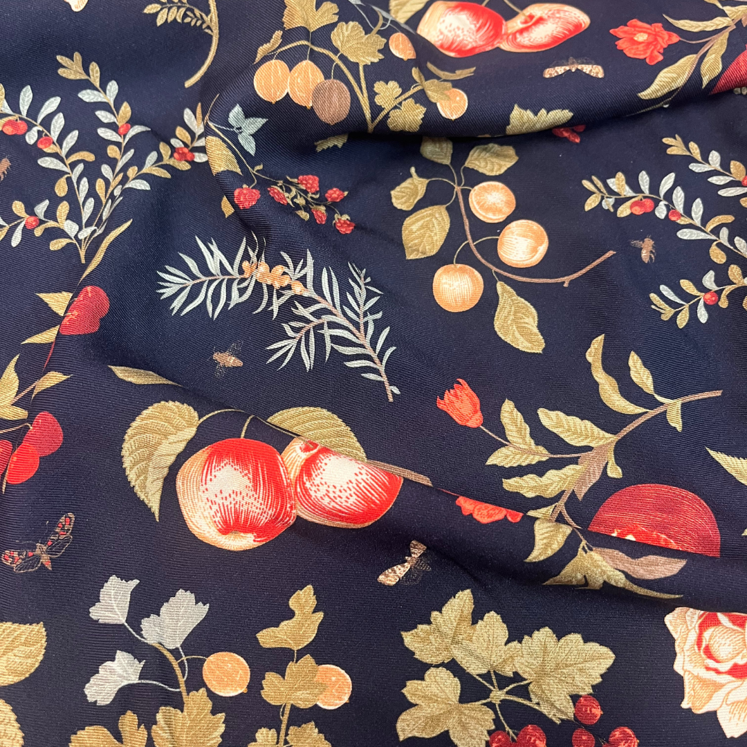Bring a touch of the harvest season into your handmade wardrobe with this gorgeous digital print rayon. Set on a chic black base, this fabric features a whimsical autumnal veg patch design making it a standout choice for playful yet stylish garments.