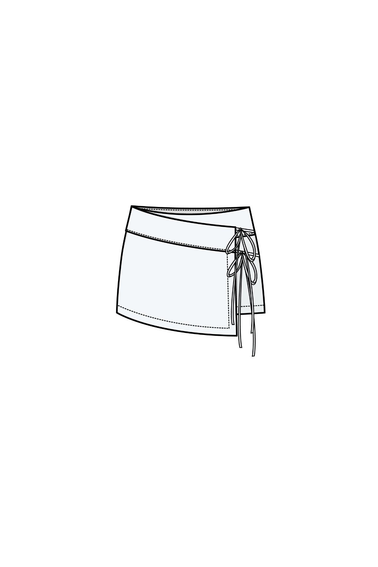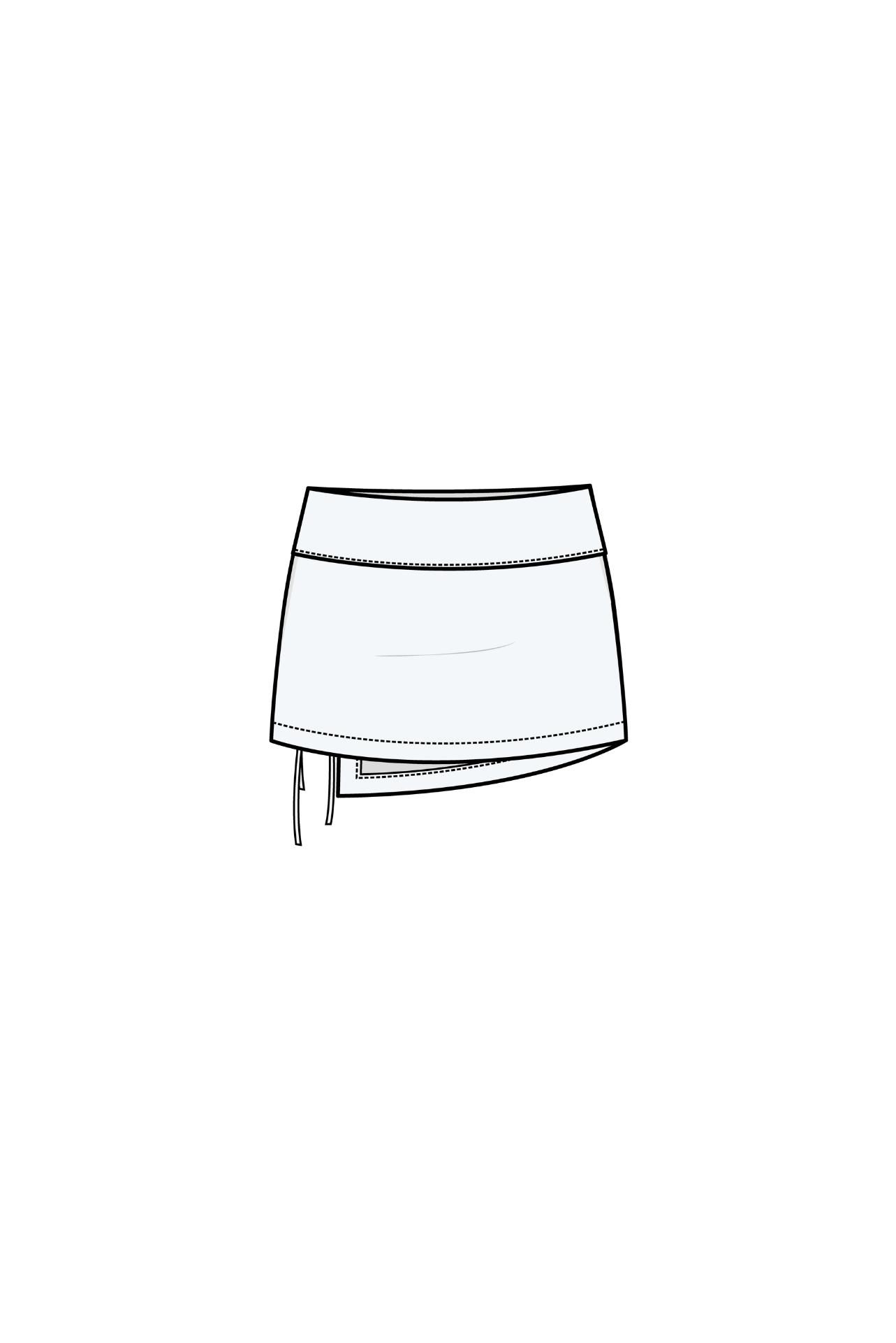 The COPENHAGEN skirt is a low-waisted wrap skirt with two ties at the front side. The skirt features a wide waistband and an asymmetric front overlap. It fastens with a combination of a hidden button on one side and the two ties on the other side. The skirt is without lining.