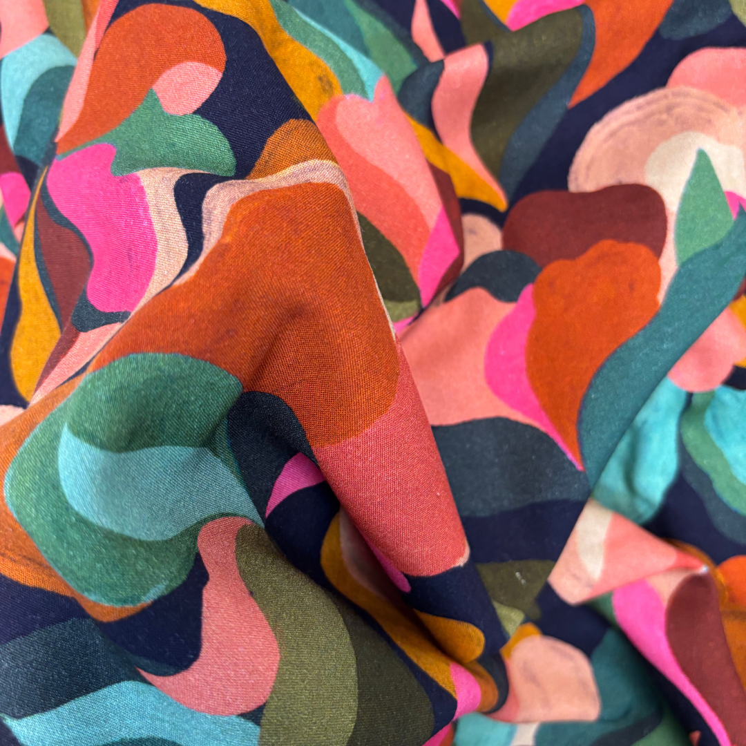 Abstract floral viscose fabric features a beautifully intricate blend of bold, flowing floral patterns with a modern, artistic twist. The design combines soft, organic shapes and vibrant hues, creating a dynamic, yet harmonious visual effect. Made from viscose, the fabric boasts a luxurious drape and a silky smooth texture, making it comfortable and breathable. The abstract floral motifs add a contemporary edge to this versatile fabric, perfect for creating stylish garments such as dresses, blouses, or skirts, as well as home decor items like cushions or curtains.