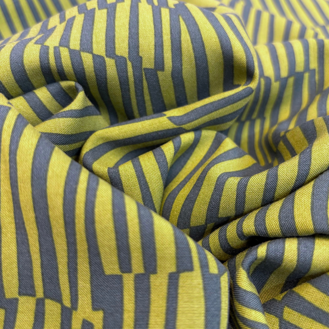 Abstract green stripes viscose fabric features a modern, dynamic design with bold, flowing stripes in various shades of green. The stripes are subtly irregular, creating an abstract effect that adds depth and movement to the fabric. Made from soft, breathable viscose, this fabric has a smooth, fluid texture and a luxurious drape, making it perfect for comfortable, stylish clothing. Its lightweight nature ensures it moves beautifully, ideal for dresses, tops, skirts, or even scarves.