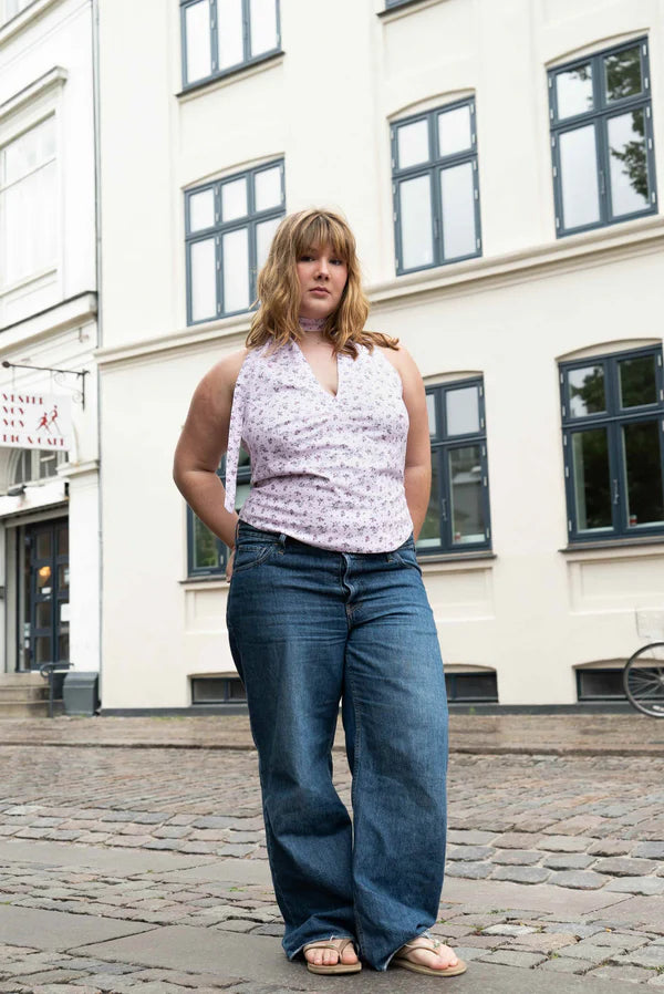 The HALTER Top is a close-fitting style with a low-cut halter neckline that ends in two scarves hanging down at the front and back. Additionally, there is a seam under the bust.
