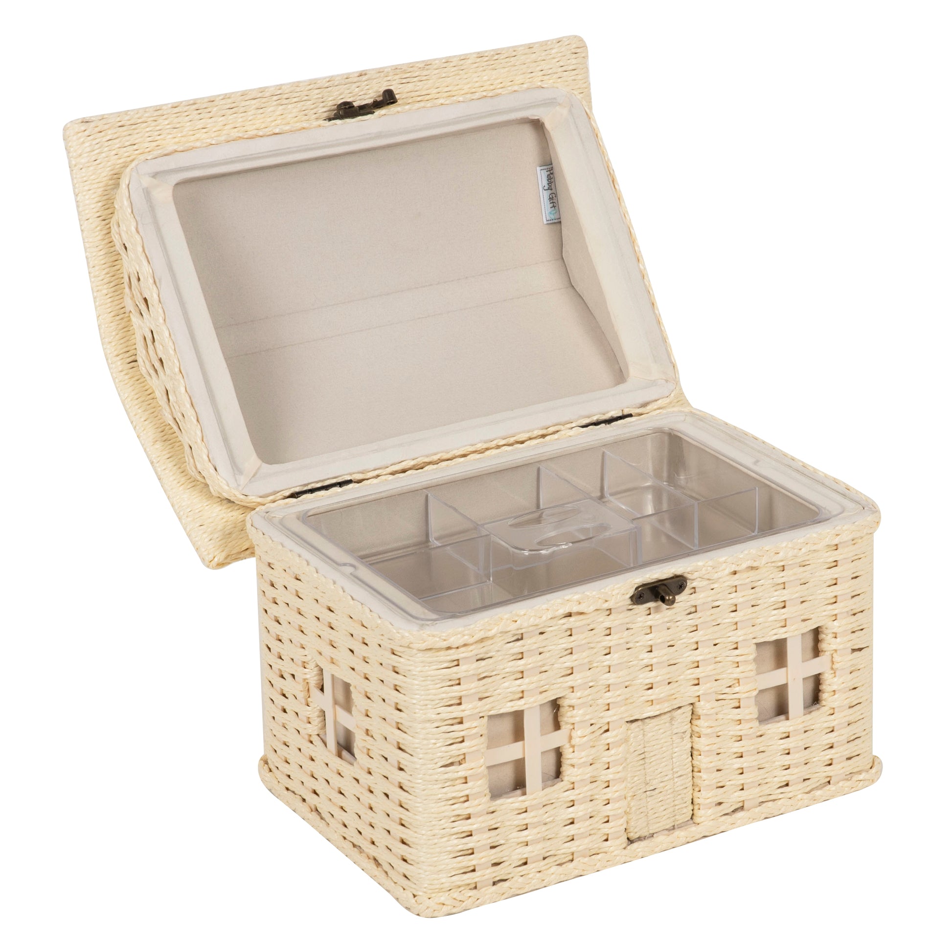Meet your new craft corner showstopper! This charming house-shaped sewing box is more than just a storage solution—it's the perfect piece of home decor (get it?). Made from durable faux wicker with a single raffia-covered handle and secure metal closure, it’s perfect for keeping all your sewing bits organized in style. Inside, you’ll find a sturdy tray with compartments to neatly tuck away your accessories.