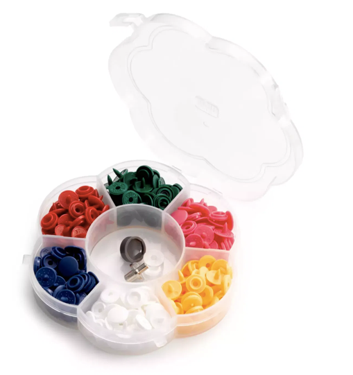 Absolutely perfect for baby's and children's garments The popular Color Snaps Mini are manufactured in high-quality plastic and the VARIO pliers are the only tool you need for attaching them to the garment. The enclosed tool set and the step-by-step instructions, together with the fact that there is no need to make holes before starting, make it easy at the very first attempt to work with these press fasteners, even for beginners.