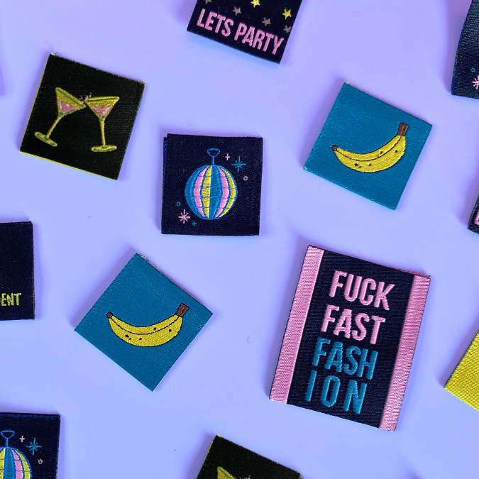 All labels have a centre fold, making them easy to add into any garment.  All measure 9mm x 9mm except the Fast Fashion label which is 14mm x 18mm.