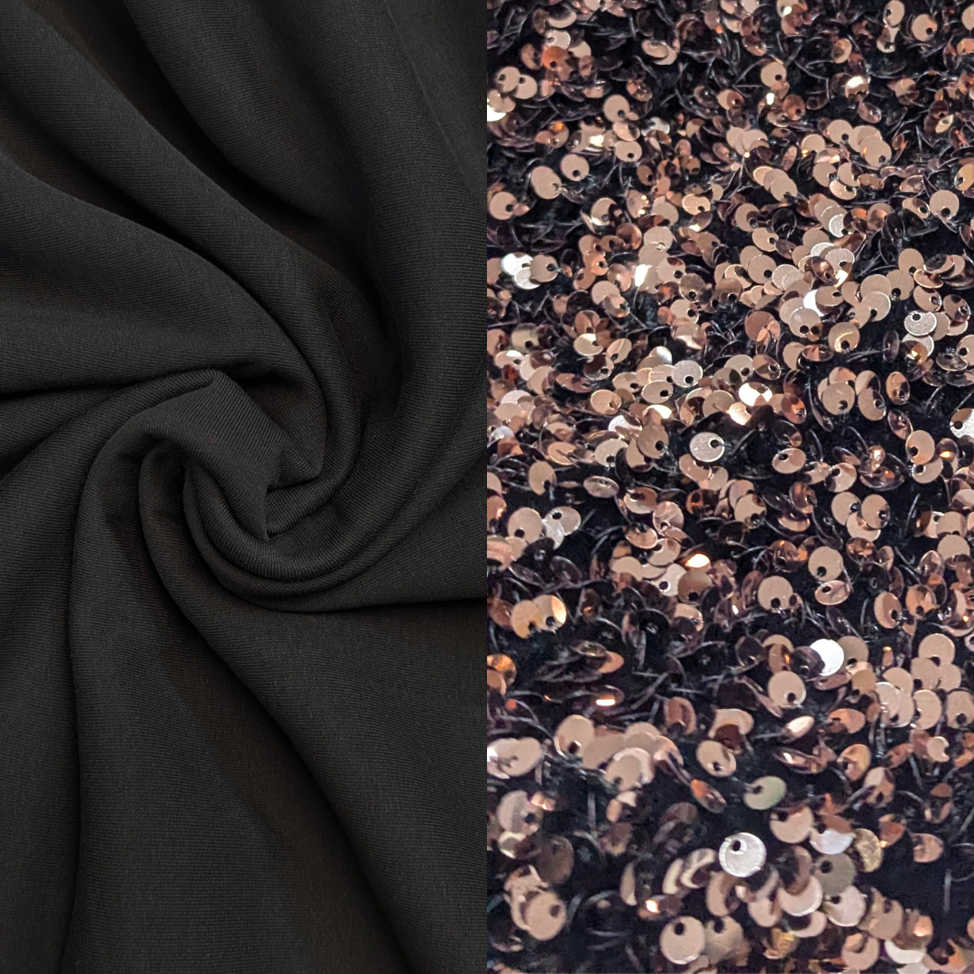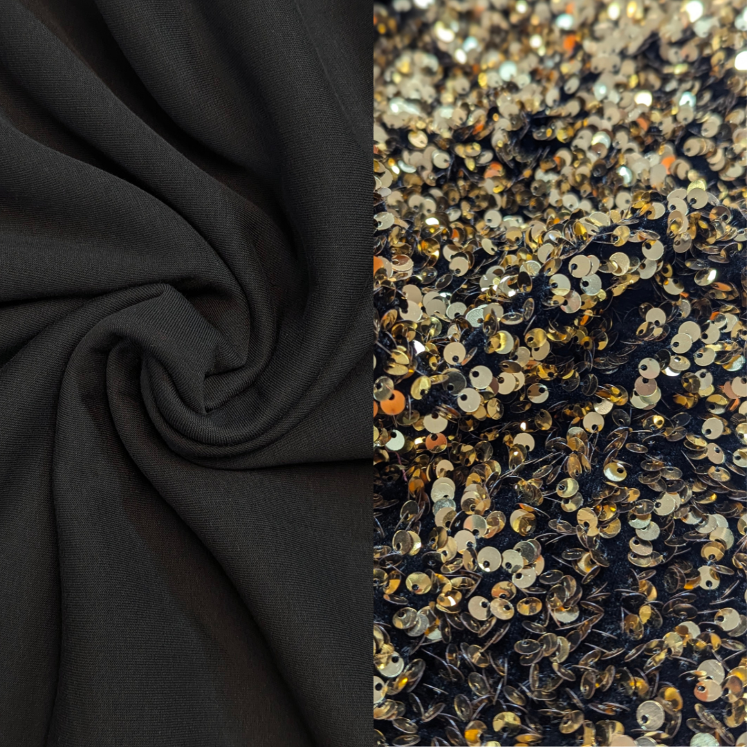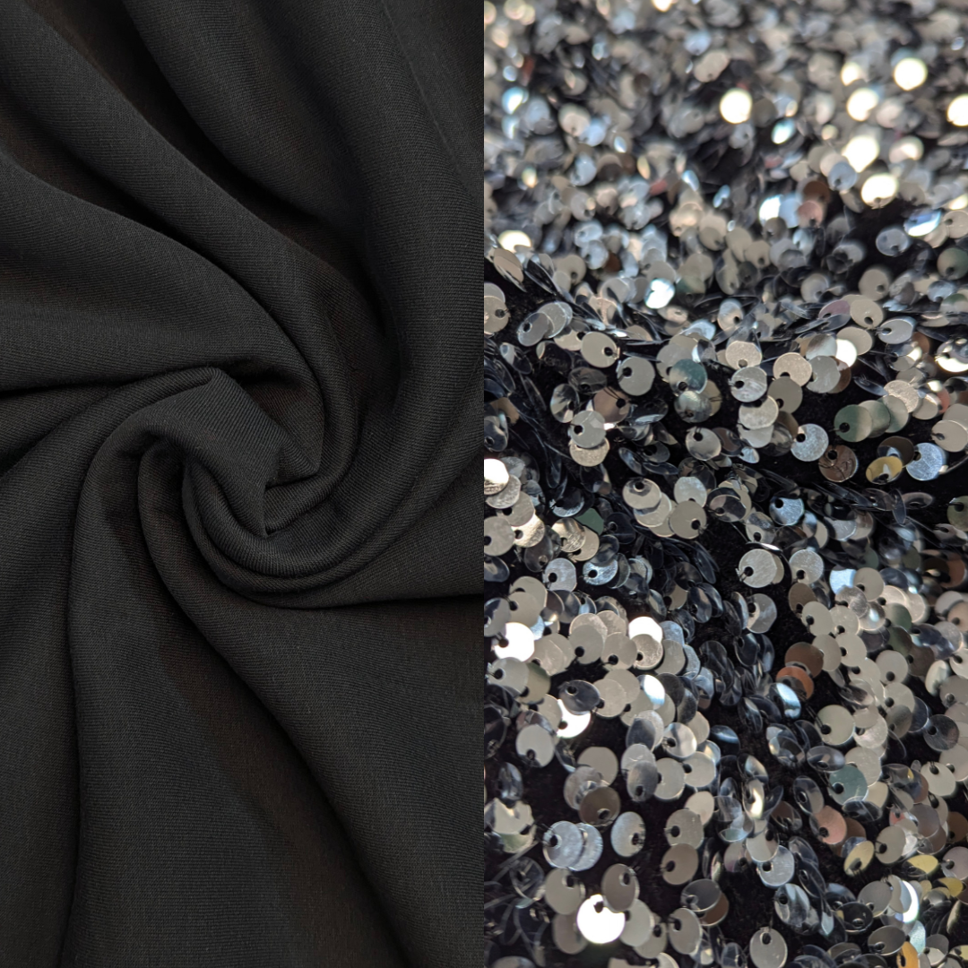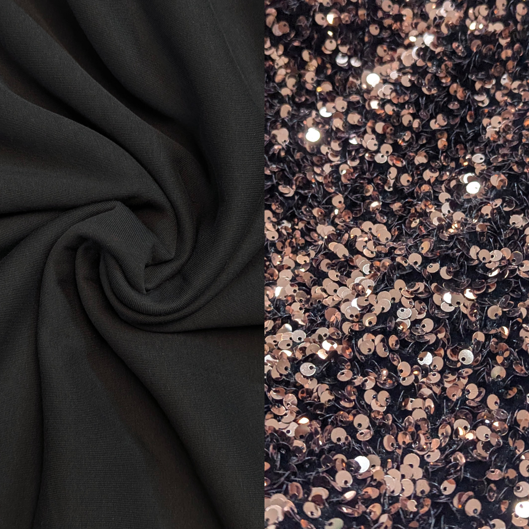 You'll get enough fabric in this kit to make a top with a sweatshirt bodice and sequin sleeves in all sizes in the Tilly and The Buttons Drew pattern size chart. You could use leftover sweatshirting for the cuffs and collars or use the velour selvedge from the sequin fabric. You really have so many options with this project and the pattern is definitely something you'd make over and over again!