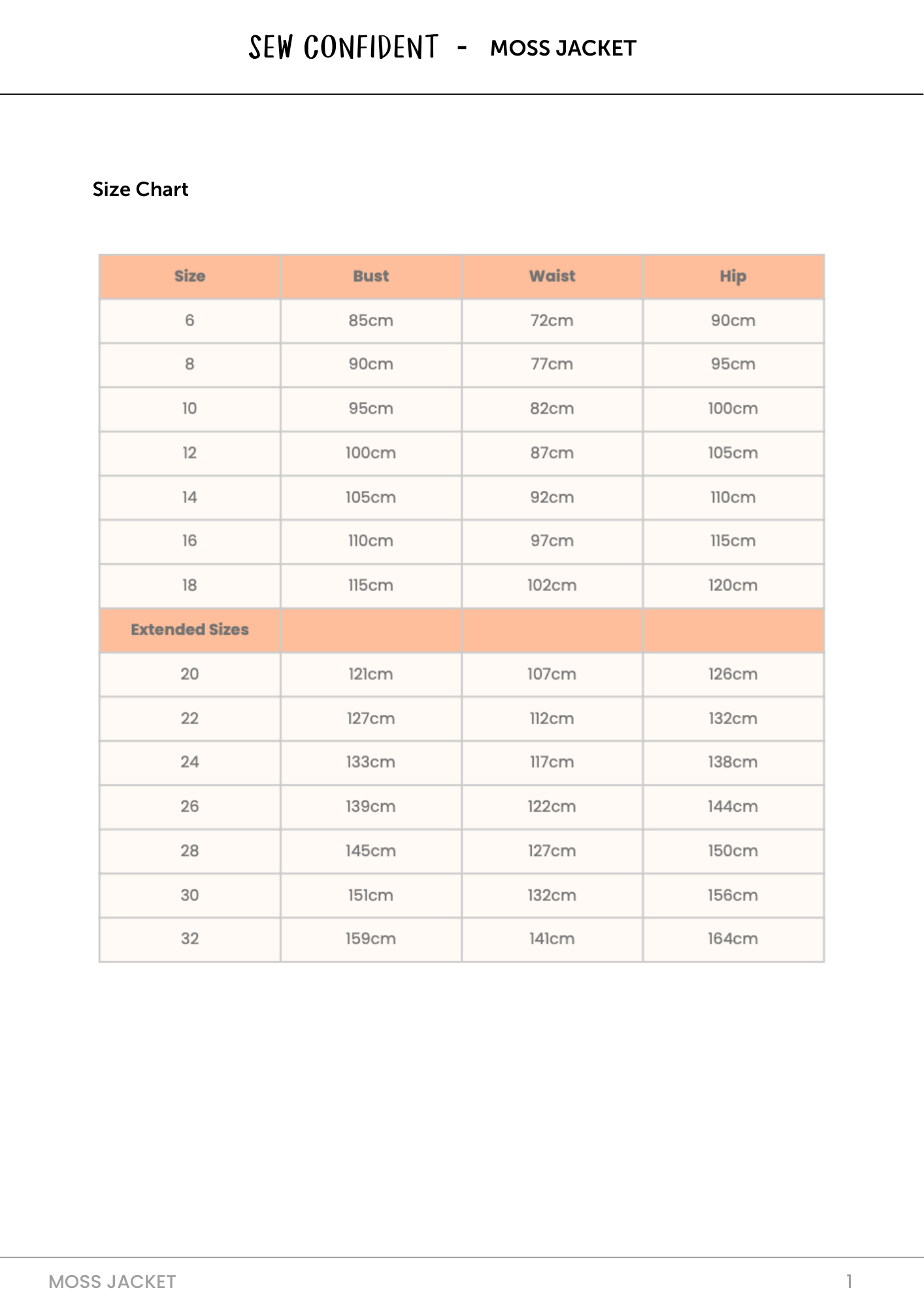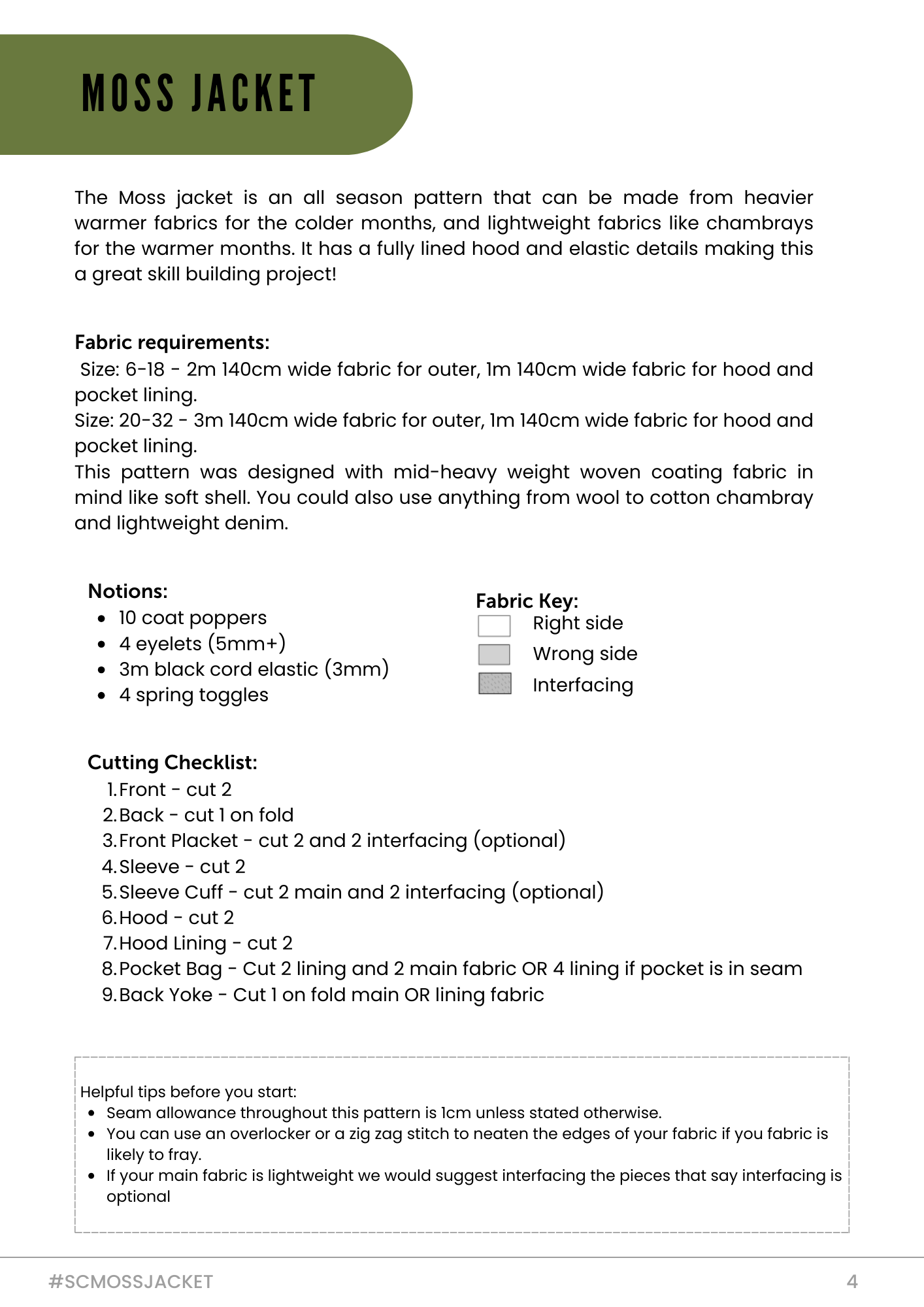 Size: 20-32 - 3m 140cm wide fabric for outer, 1m 140cm wide fabric for hood and pocket lining.