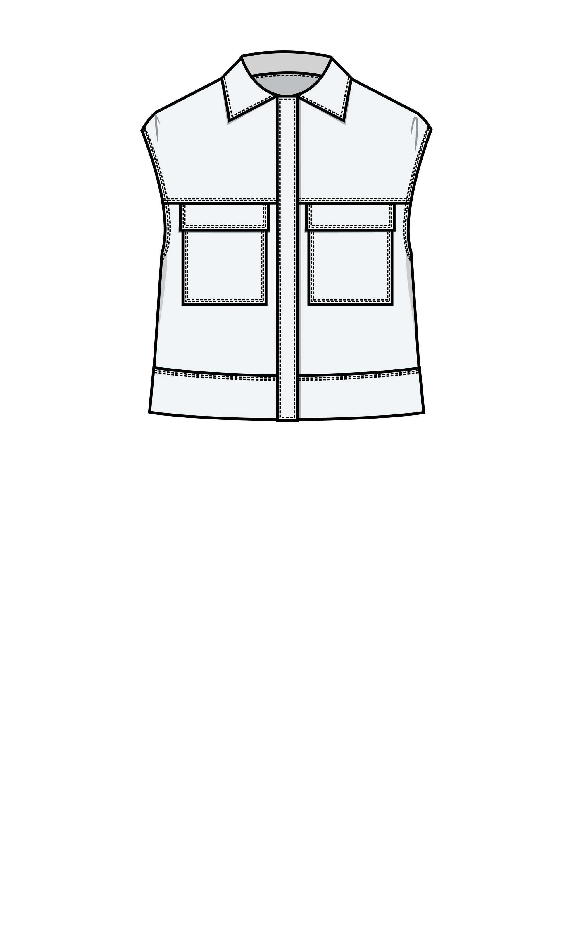 The TOPSTITCH vest features a trendy drop shoulder and two big pockets on the front, making it both stylish and functional. We have added snap fasteners to the plackets. The BOX sleeve has lots of volume and a wide cuff and complements the boxy look of the TOPSTITCH vest perfectly.